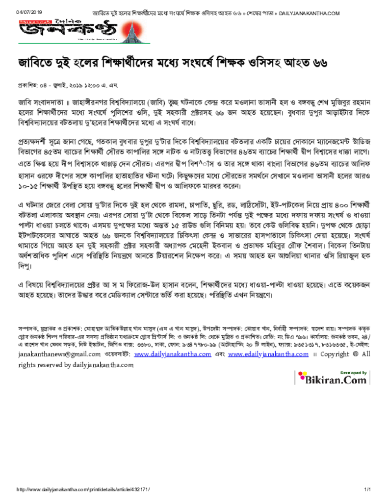 জাবিতে দুই হলের শিক্ষার্থীদের মধ্যে সংঘর্ষে শিক্ষক ওসিসহ আহত ৬৬ » শেষের পাতা » DAILYJANAKANTHA.COM