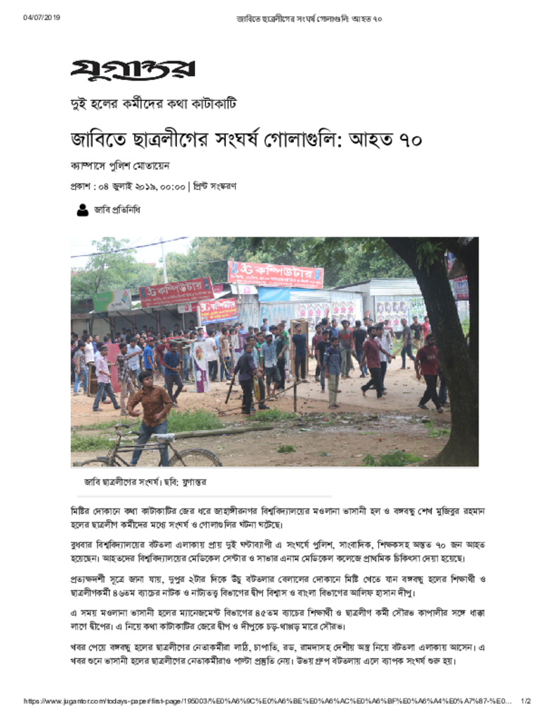 জাবিতে ছাত্রলীগের সংঘর্ষ গোলাগুলি_ আহত ৭০ Published on Newspaper দৈনিক যুগান্তর Category Campus Terrorism Download