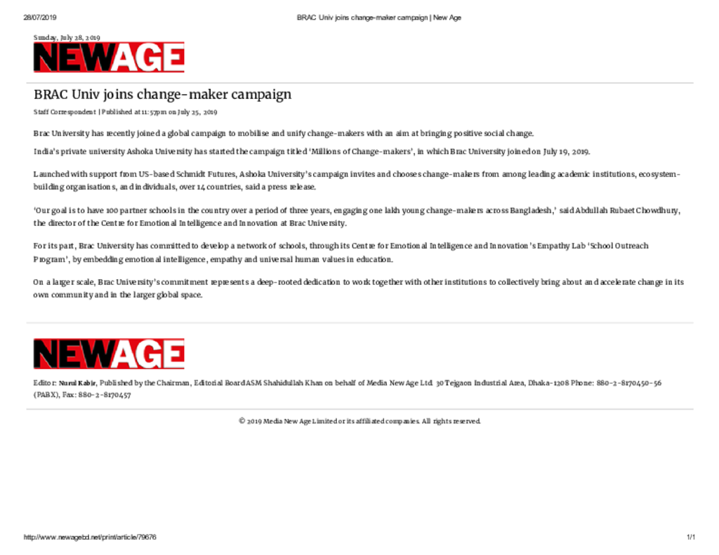 BRAC Univ joins change-maker campaign _ New Age Published on Newspaper New Age Category General Education General Education Higher Education Private Download