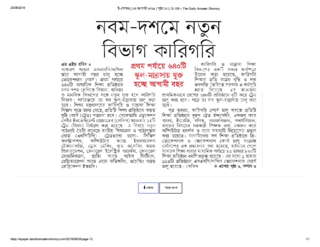 নবম দশমে নতুন বিভাগ কারিগরি ১ম অংশ Published on Newspaper দৈনিক আমাদের সময় Category Technical and Vocational Education General Education Download