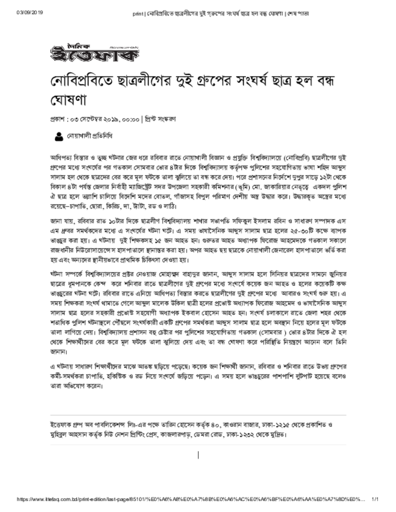print _ নোবিপ্রবিতে ছাত্রলীগের দুই গ্রুপের সংঘর্ষ ছাত্র হল বন্ধ ঘোষণা _ শেষ পাতা Published on Newspaper দৈনিক ইত্তেফাক Category Campus Terrorism Download