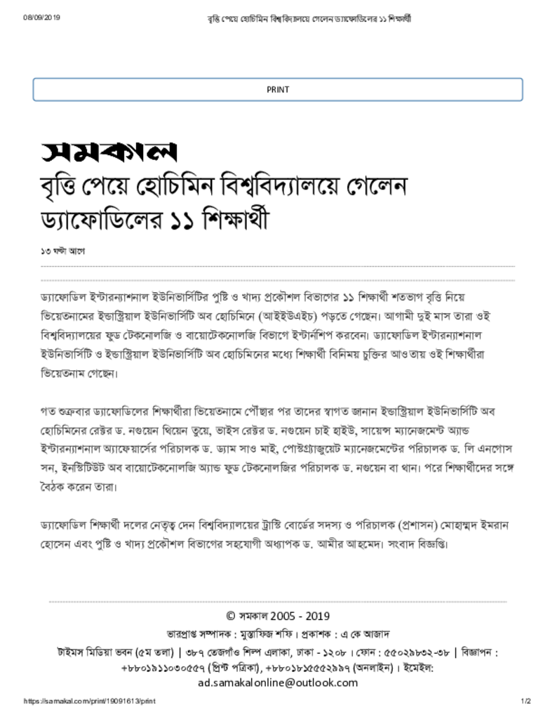 বৃত্তি পেয়ে হোচিমিন বিশ্ববিদ্যালয়ে গেলেন ড্যাফোডিলের ১১ শিক্ষার্থী Published on Newspaper দৈনিক সমকাল Category General Education General Education Higher Education Private Download
