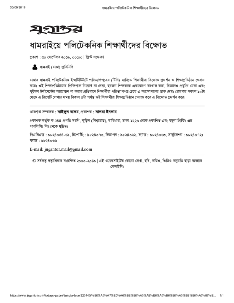 ধামরাইয়ে পলিটেকনিক শিক্ষার্থীদের বিক্ষোভ Published on Newspaper দৈনিক যুগান্তর Category Technical and Vocational Education Download
