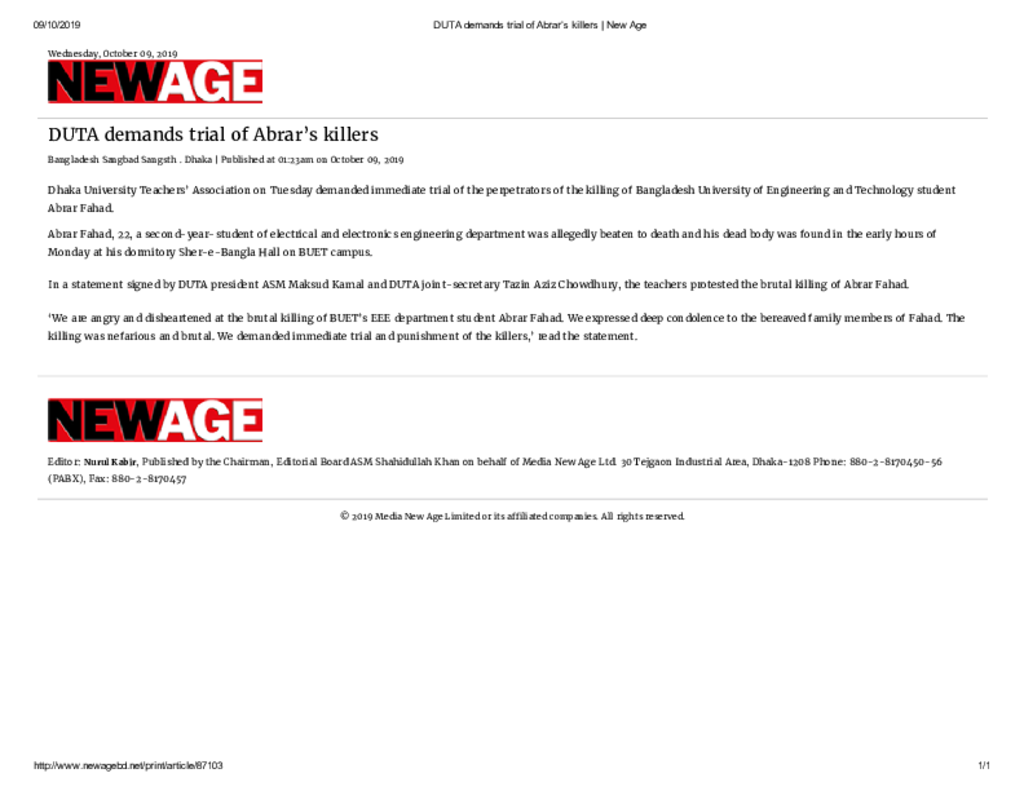 DUTA demands trial of Abrar’s killers _ New Age Published on Newspaper New Age Category Campus Terrorism Download
