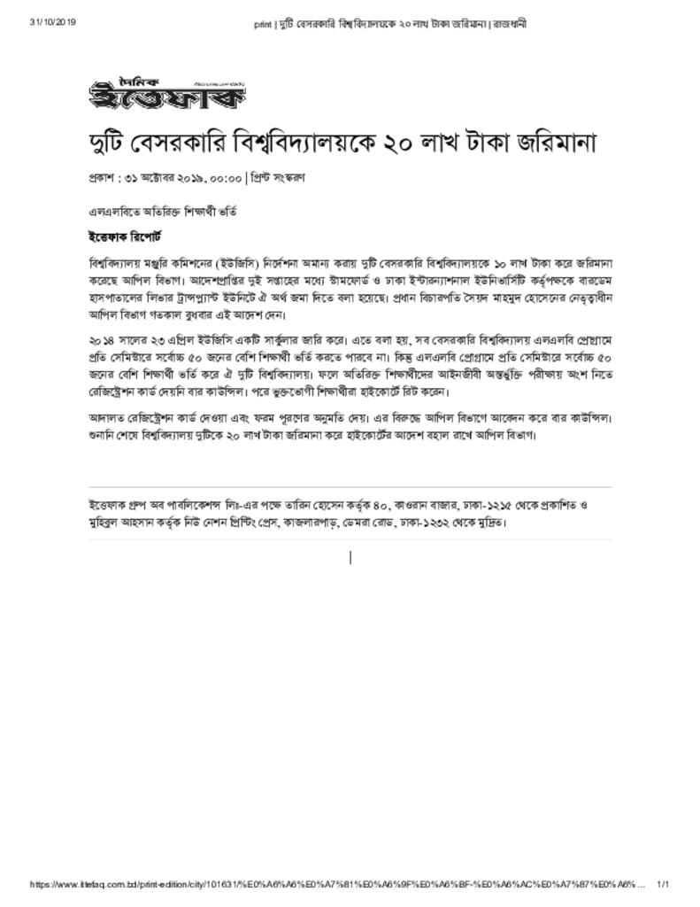 print _ দুটি বেসরকারি বিশ্ববিদ্যালয়কে ২০ লাখ টাকা জরিমানা _ রাজধানী Published on Newspaper দৈনিক ইত্তেফাক Category General Education General Education Higher Education Private Download