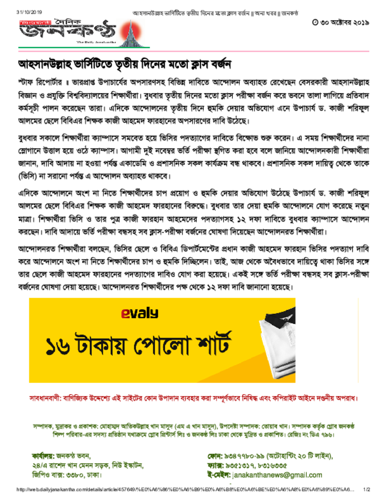আহসানউল্লাহ ভার্সিটিতে তৃতীয় দিনের মতো ক্লাস বর্জন __ অন্য খবর __ জনকন্ঠ Published on Newspaper দৈনিক জনকণ্ঠ Category General Education General Education Higher Education Private Download