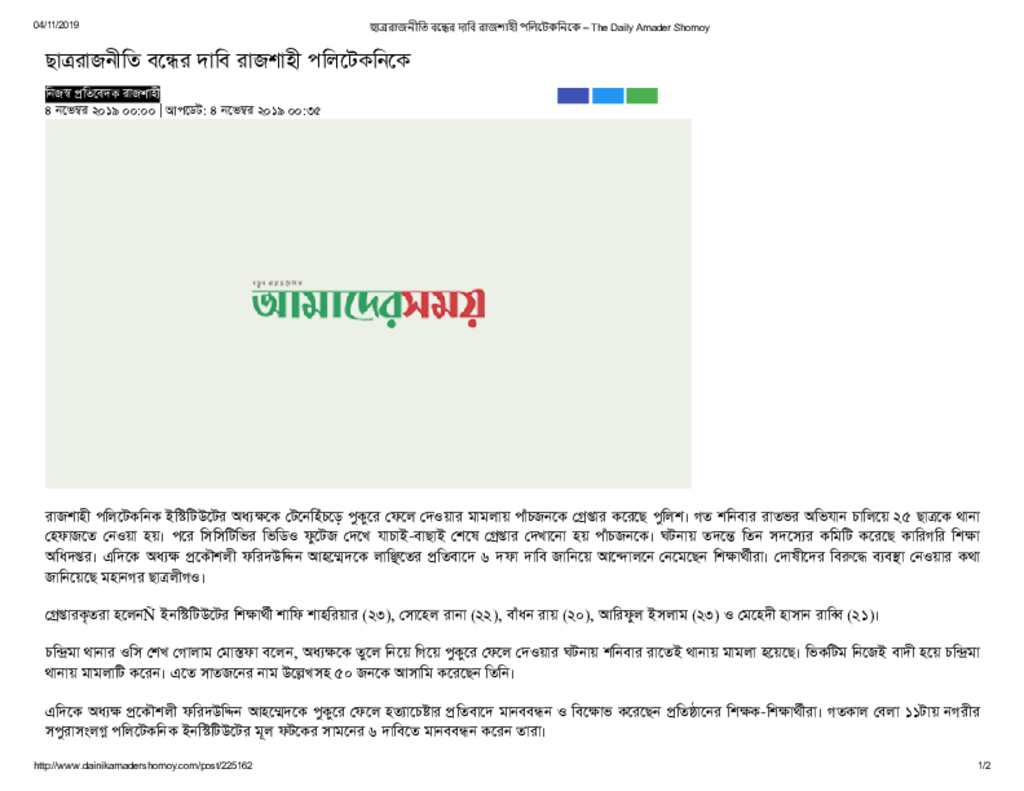 ছাত্ররাজনীতি বন্ধের দাবি রাজশাহী পলিটেকনিকে – The Daily Amader Shomoy Published on Newspaper দৈনিক আমাদের সময় Category Technical and Vocational Education Download