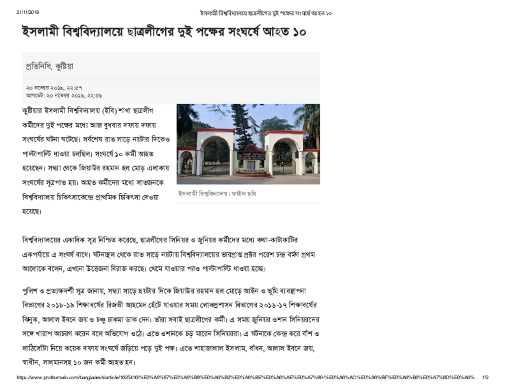 ইসলামী বিশ্ববিদ্যালয়ে ছাত্রলীগের দুই পক্ষের সংঘর্ষে আহত ১০ Published on Newspaper দৈনিক প্রথম আলো Category Campus Terrorism Download