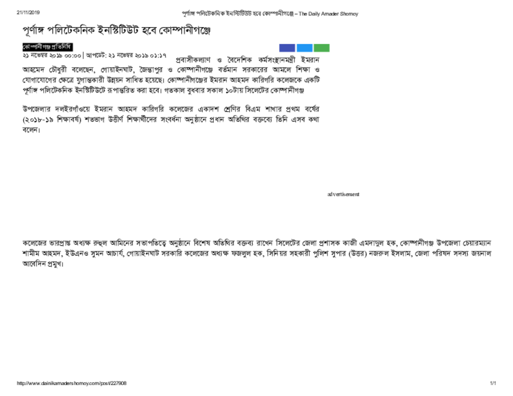 পূর্ণাঙ্গ পলিটেকনিক ইনস্টিটিউট হবে কোম্পানীগঞ্জে – The Daily Amader Shomoy Published on Newspaper দৈনিক আমাদের সময় Category Technical and Vocational Education Download
