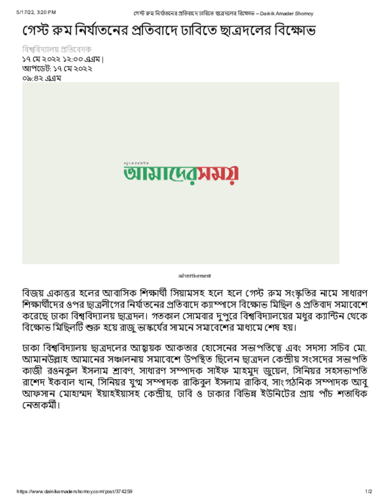 গেস্ট রুম নির্যাতনের প্রতিবাদে ঢাবিতে ছাত্রদলের বিক্ষোভ – Dainik Amader Shomoy Published on 17 May 2022 Newspaper দৈনিক আমাদের সময় Category Campus Terrorism General Education Higher Education Public Download