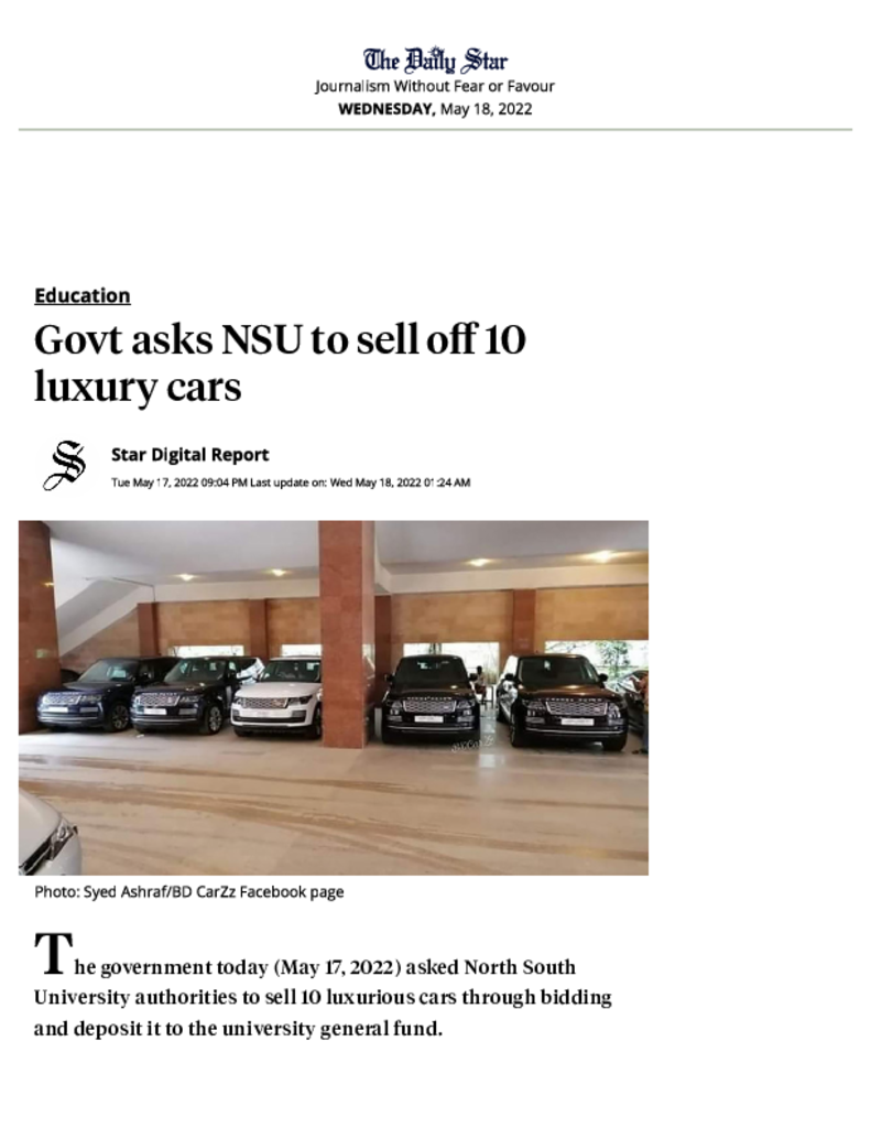 Govt asks NSU to sell off 10 luxury cars I The Daily Star _ undefined Published on 18 May 2022 Newspaper The Daily Star Category Educational Ministry / Departments General Education Higher Education Private Download