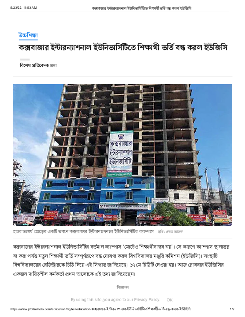 কক্সবাজার ইন্টারন্যাশনাল ইউনিভার্সিটিতে শিক্ষার্থী ভর্তি বন্ধ করল ইউজিসি
