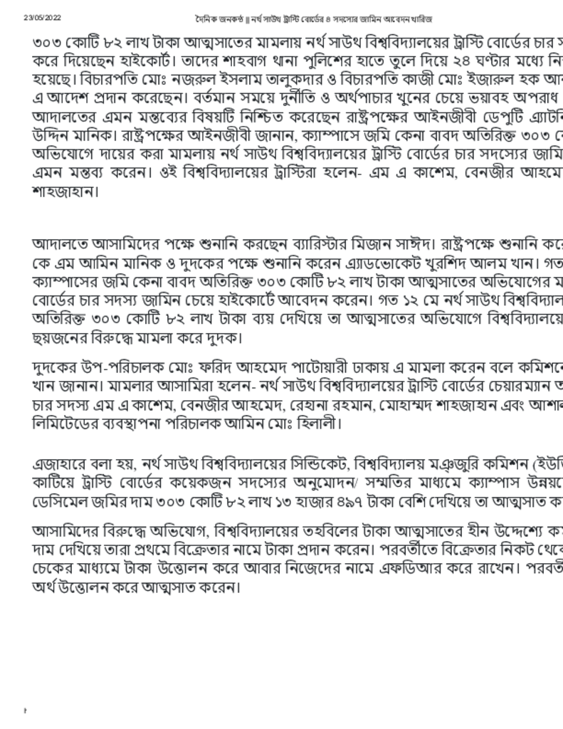 দৈনিক জনকন্ঠ __ নর্থ সাউথ ট্রাস্টি বোর্ডের ৪ সদস্যের জামিন আবেদন খারিজ