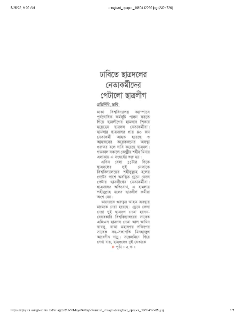 ঢাবিতে ছাত্রদলের নেতাকর্মীদের পেটালো ছাত্রলীগ Published on 25 May 2022 Newspaper দৈনিক সংবাদ Category Campus Terrorism Download