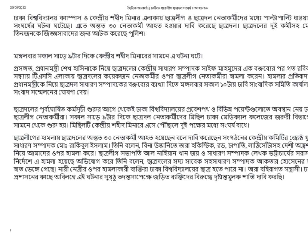দৈনিক জনকন্ঠ __ ঢাবিতে ছাত্রলীগ ছাত্রদল সংঘর্ষ ॥ আহত ৩০ Published on 25 May 2022 Newspaper দৈনিক জনকণ্ঠ Category Campus Terrorism Download
