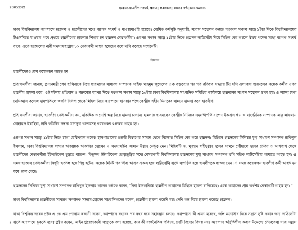 ছাত্রদল-ছাত্রলীগ সংঘর্ষ, ধাওয়া Published on 25 May 2022 Newspaper দৈনিক কালের কন্ঠ Category Campus Terrorism Download