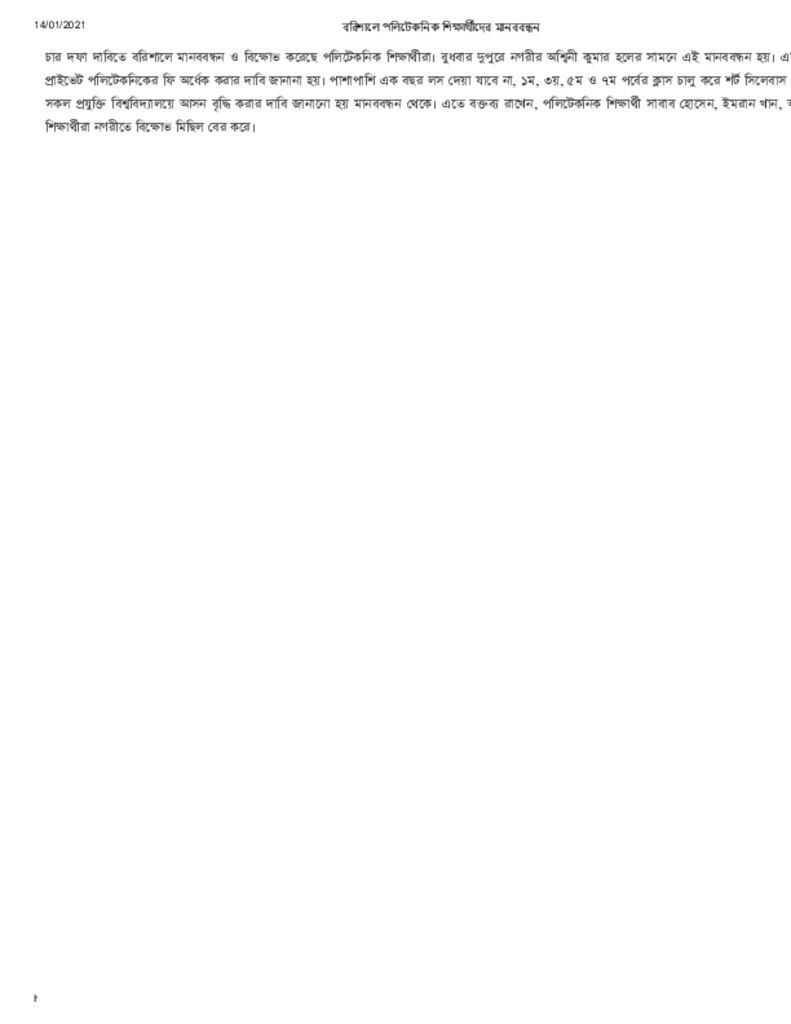 বরিশালে পলিটেকনিক শিক্ষার্থীদের মানববন্ধন Published on 14 January 2021 Newspaper দৈনিক ইত্তেফাক Category Technical and Vocational Education Download
