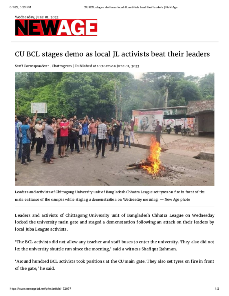 CU BCL stages demo as local JL activists beat their leaders _ New Age Published on 01 June 2022 Newspaper New Age Category Campus Terrorism Download