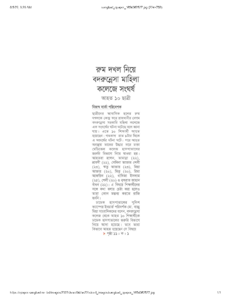রুম দখল নিয়ে বদরুন্নেসা মহিলা কলেজে সংঘর্ষ Published on 05 June 2022 Newspaper দৈনিক সংবাদ Category Campus Terrorism Download