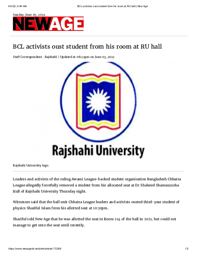 BCL activists oust student from his room at RU hall _ New Age Published on 03 June 2022 Newspaper New Age Category Campus Terrorism Download
