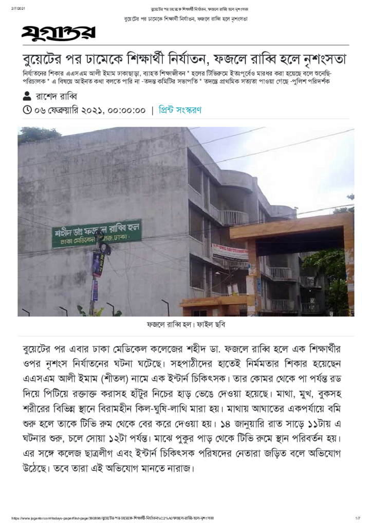 বুয়েটের পর ঢামেকে শিক্ষার্থী নির্যাতন, ফজলে রাব্বি হলে নৃশংসতা Published on 06 February 2021 Newspaper দৈনিক যুগান্তর Category Campus Terrorism Download