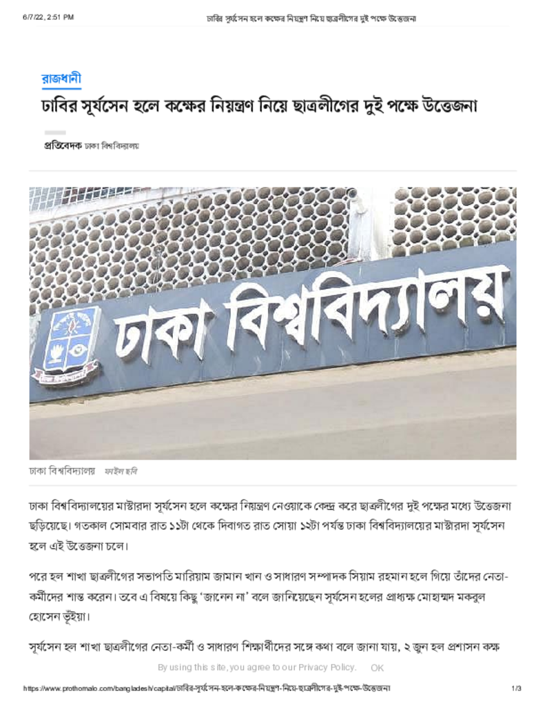 ঢাবির সূর্যসেন হলে কক্ষের নিয়ন্ত্রণ নিয়ে ছাত্রলীগের দুই পক্ষে উত্তেজনা Published on 07 June 2022 Newspaper দৈনিক প্রথম আলো Category Campus Terrorism Download