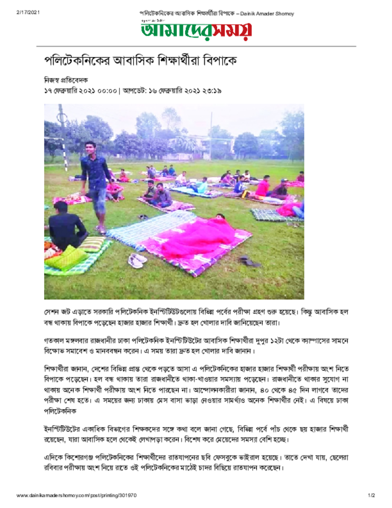 পলিটেকনিকের আবাসিক শিক্ষার্থীরা বিপাকে – Dainik Amader Shomoy Published on 17 February 2021 Newspaper দৈনিক আমাদের সময় Category Technical and Vocational Education Download