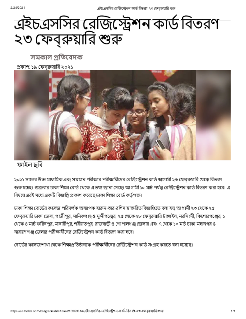 এইচএসসির রেজিস্ট্রেশন কার্ড বিতরণ ২৩ ফেব্রুয়ারি শুরু