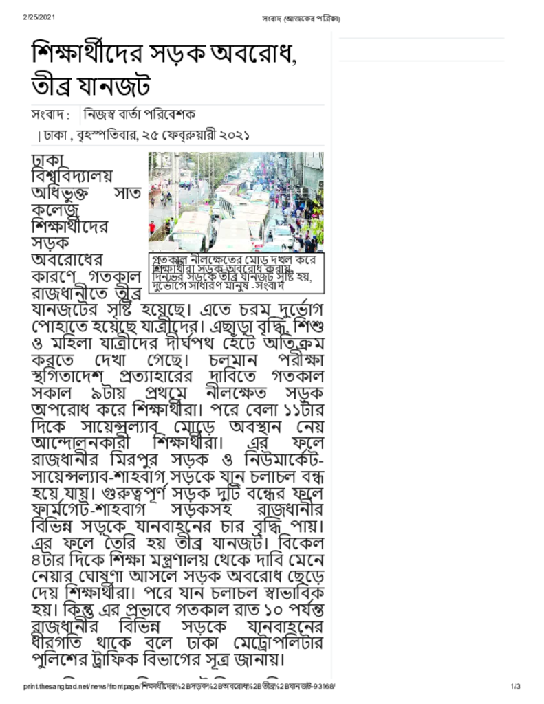 শিক্ষার্থীদের সড়ক অবরোধ, তীব্র যানজট Published on 25 February 2021 Newspaper দৈনিক সংবাদ Category Campus Terrorism Download