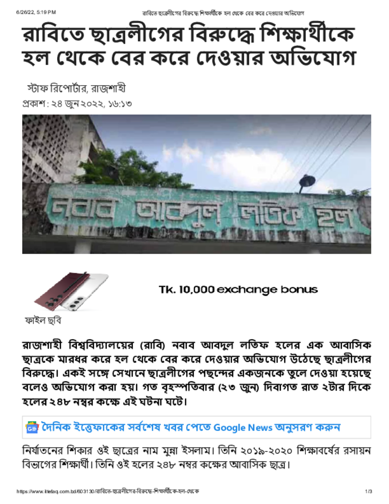রাবিতে ছাত্রলীগের বিরুদ্ধে শিক্ষার্থীকে হল থেকে বের করে দেওয়ার অভিযোগ Published on 24 June 2022 Newspaper দৈনিক ইত্তেফাক Category Campus Terrorism Download