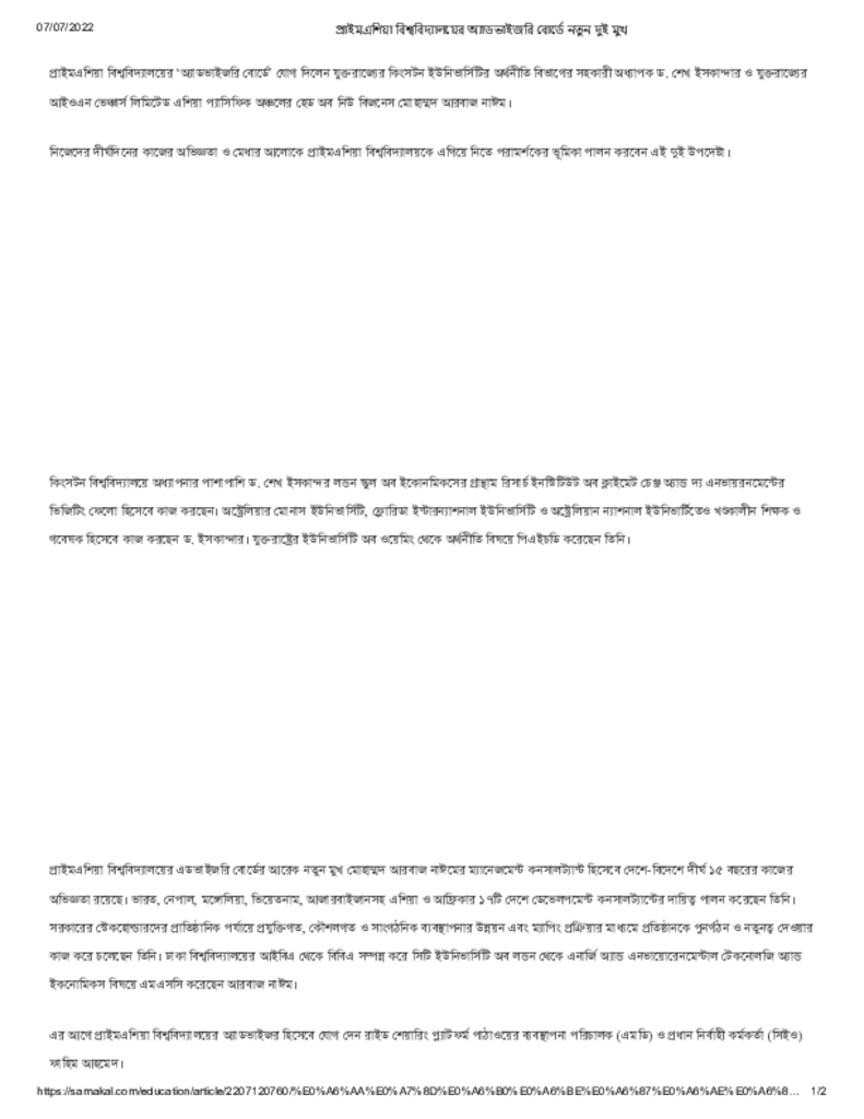 প্রাইমএশিয়া বিশ্ববিদ্যালয়ের অ্যাডভাইজরি বোর্ডে নতুন দুই মুখ Published on 07 July 2022 Newspaper দৈনিক সমকাল Category General Education General Education Higher Education Private Download