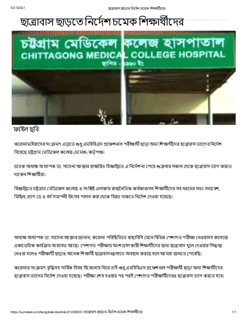 ছাত্রাবাস ছাড়তে নির্দেশ চমেক শিক্ষার্থীদের Published on 19 March 2021 Newspaper দৈনিক সমকাল Category Campus Terrorism Download