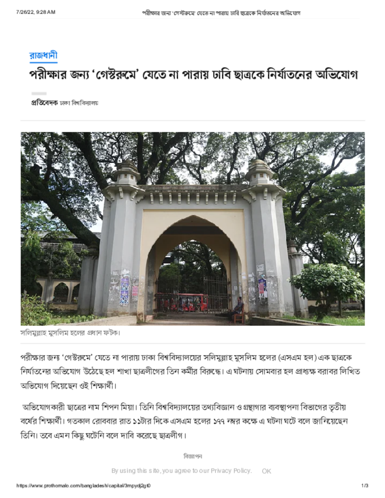 পরীক্ষার জন্য ‘গেস্টরুমে’ যেতে না পারায় ঢাবি ছাত্রকে নির্যাতনের অভিযোগ Published on 25 July 2022 Newspaper দৈনিক প্রথম আলো Category Campus Terrorism Download