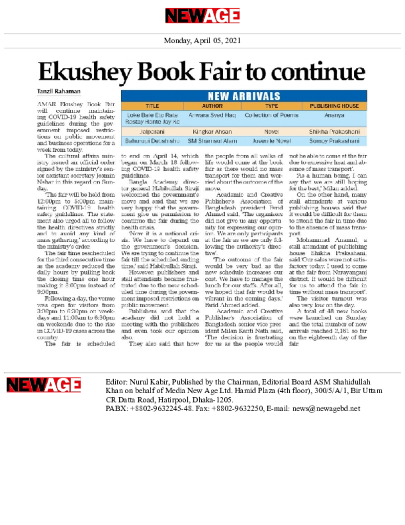Ekushey Book Fair to continue Published on 05 April 2021 Newspaper New Age Category Book Fair Download