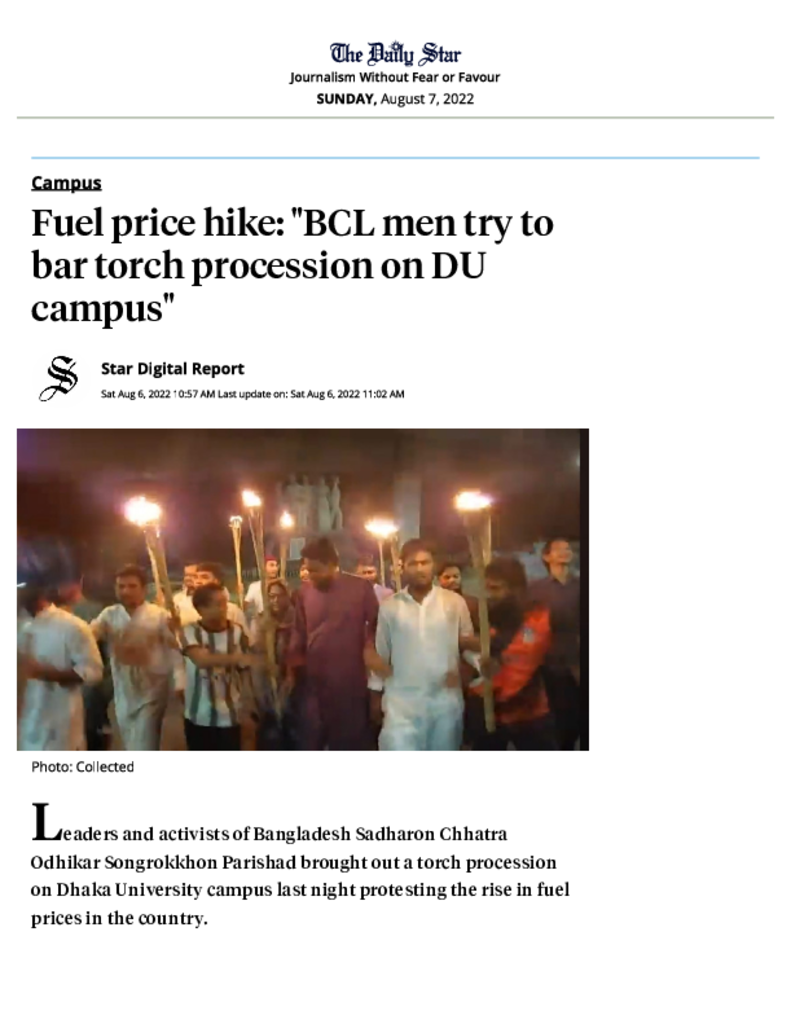 Fuel price hike_ _BCL men try to bar torch procession on DU campus_ _ The Daily Star Published on 06 August 2022 Newspaper The Daily Star Category Campus Terrorism Download