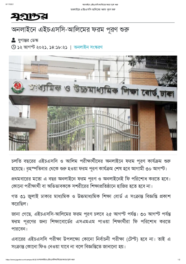 অনলাইনে এইচএসসি-আলিমের ফরম পূরণ শুরু Published on 12 April 2021 Newspaper দৈনিক যুগান্তর Category Educational Ministry / Departments Public Examination HSC Download