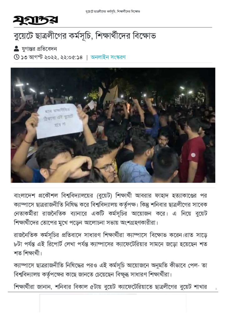 বুয়েটে ছাত্রলীগের কর্মসূচি, শিক্ষার্থীদের বিক্ষোভ Published on 13 August 2022 Newspaper দৈনিক যুগান্তর Category Campus Terrorism Download