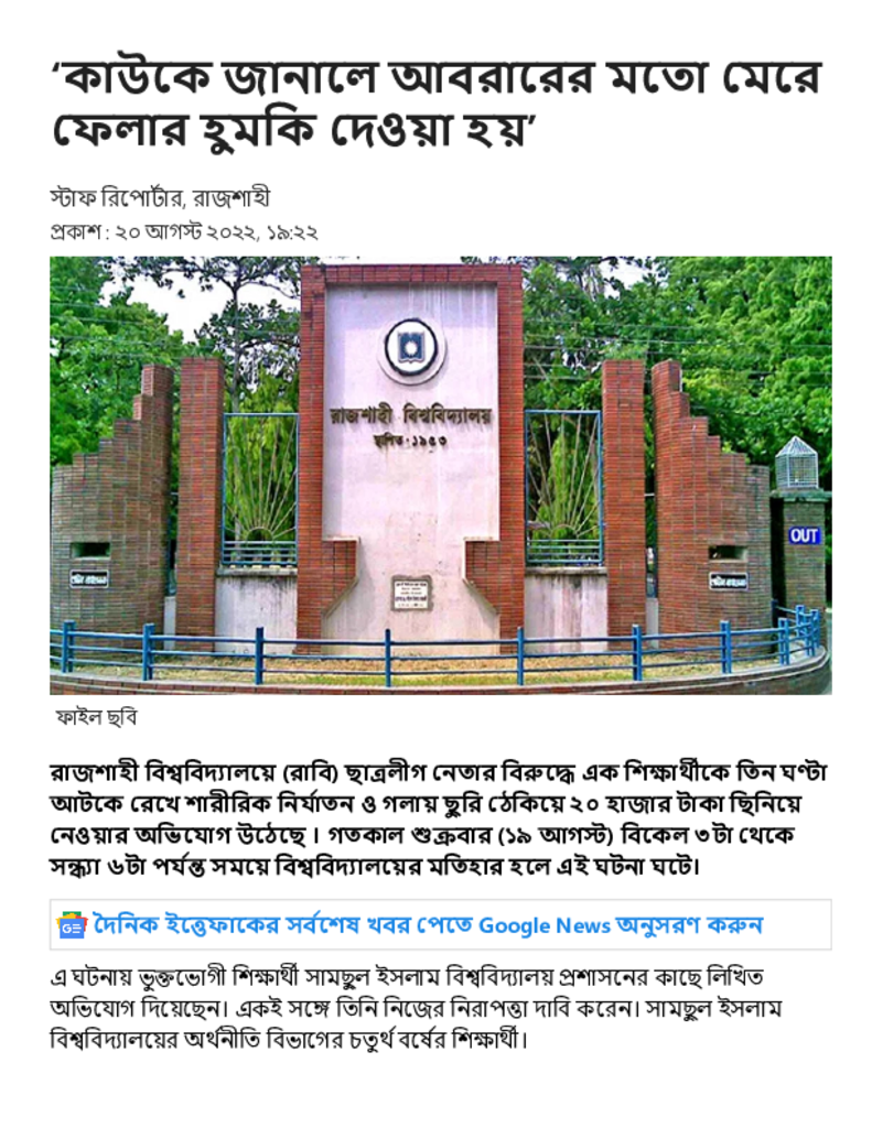 ‘কাউকে জানালে আবরারের মতো মেরে ফেলার হুমকি দেওয়া হয়’ Published on 20 August 2022 Newspaper দৈনিক ইত্তেফাক Category Campus Terrorism Download