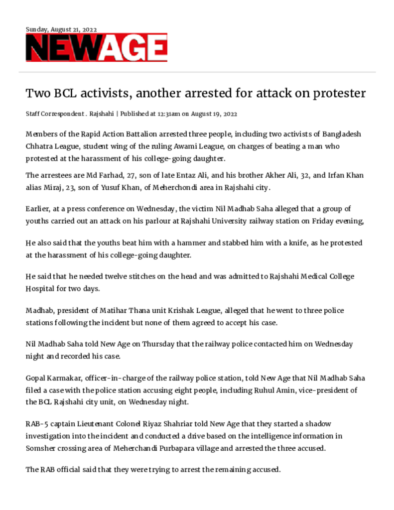 Two BCL activists, another arrested for attack on protester _ New Age Published on 18 August 2022 Newspaper New Age Category Campus Terrorism Download
