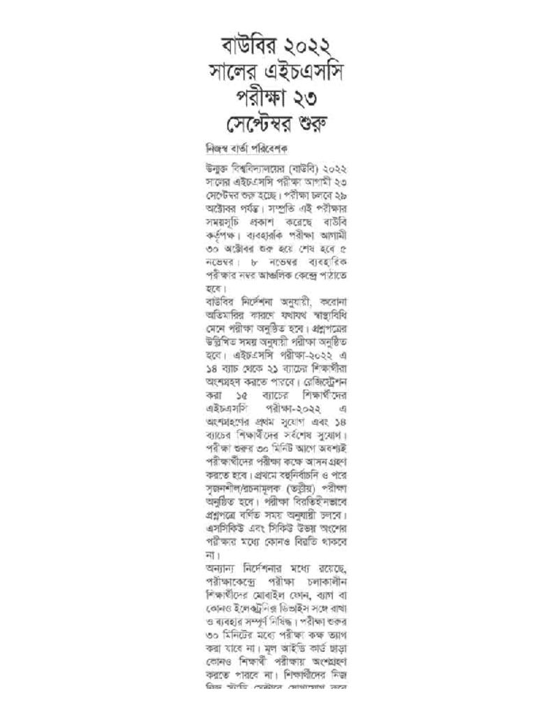 বাউবির ২০২২ সালের এইচএসসি পরীক্ষা ২৩সেপ্টেম্বর শুরু