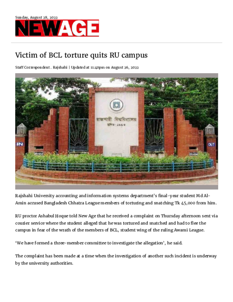 Victim of BCL torture quits RU campus _ New Age Published on 26 August 2022 Newspaper New Age Category Campus Terrorism Download