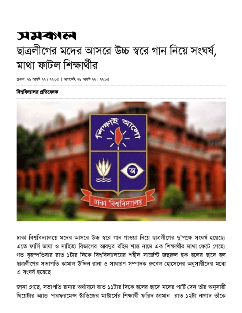 ছাত্রলীগের মদের আসরে উচ্চ স্বরে গান নিয়ে সংঘর্ষ, মাথা ফাটল শিক্ষার্থীর Published on 26 August 2022 Newspaper দৈনিক সমকাল Category Campus Terrorism Download