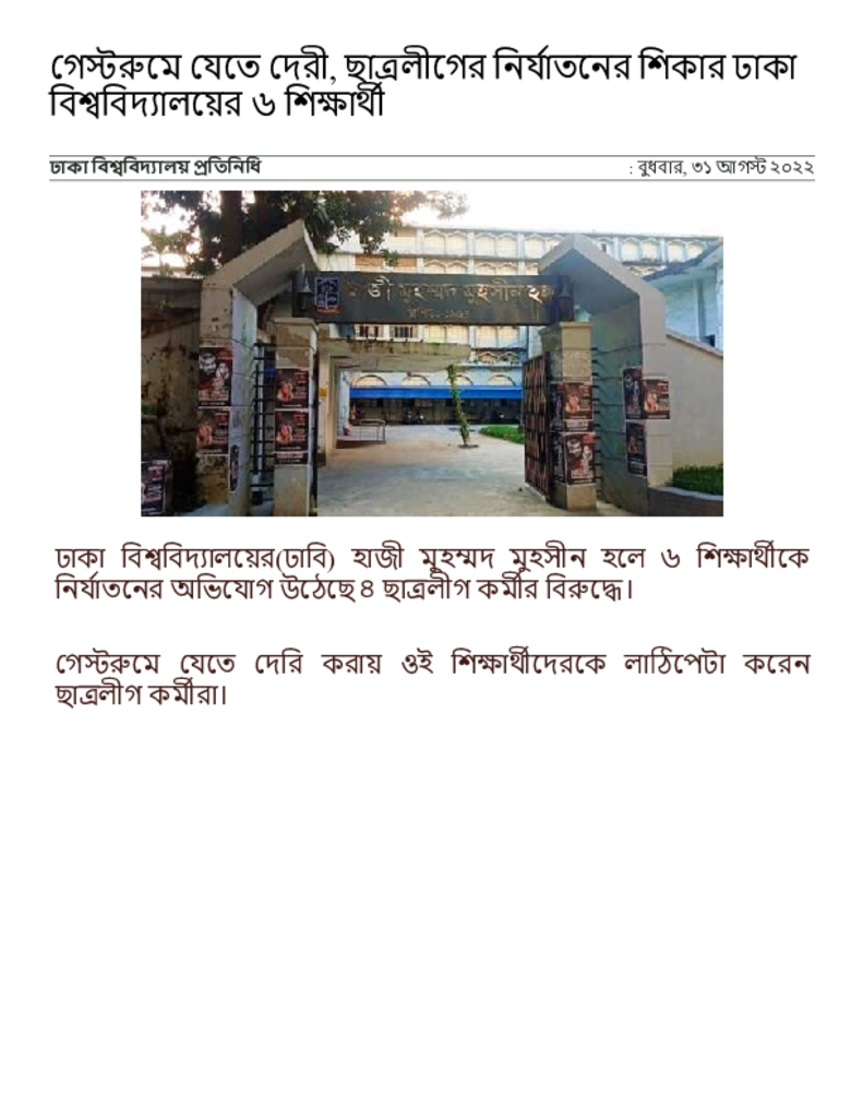 গেস্টরুমে যেতে দেরী, ছাত্রলীগের নির্যাতনের শিকার ঢাকা বিশ্ববিদ্যালয়ের ৬ শিক্ষার্থী Published on 31 August 2022 Newspaper দৈনিক সংবাদ Category Campus Terrorism General Education Higher Education Public Download