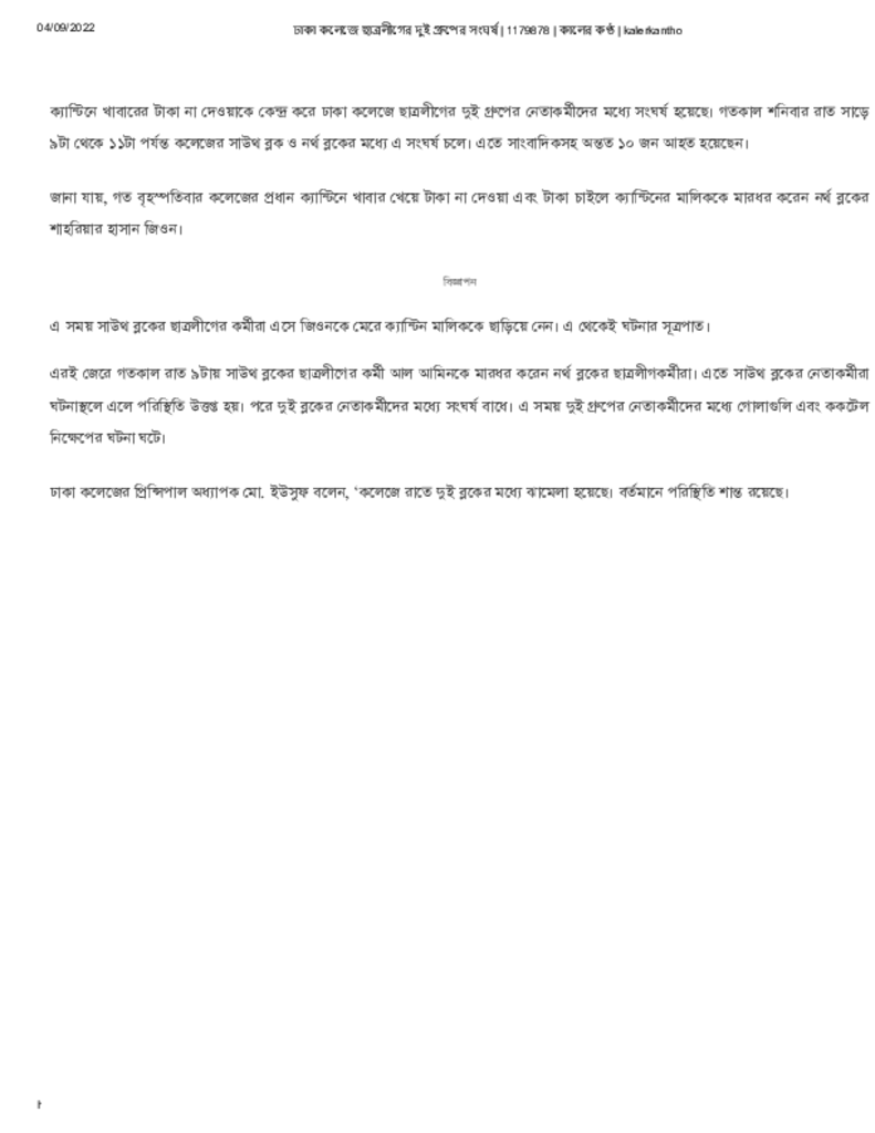 ঢাকা কলেজে ছাত্রলীগের দুই গ্রুপের সংঘর্ষ Published on 04 September 2022 Newspaper দৈনিক কালের কন্ঠ Category Campus Terrorism Download
