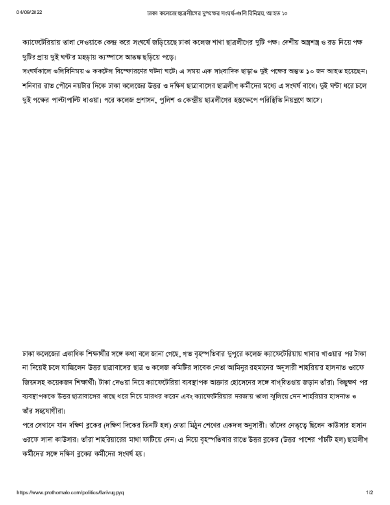 ঢাকা কলেজে ছাত্রলীগের দুপক্ষের সংঘর্ষ–গুলি বিনিময়, আহত ১০ Published on 04 September 2022 Newspaper দৈনিক প্রথম আলো Category Campus Terrorism Download