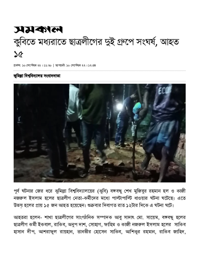 কুবিতে মধ্যরাতে ছাত্রলীগের দুই গ্রুপে সংঘর্ষ, আহত ১৫
