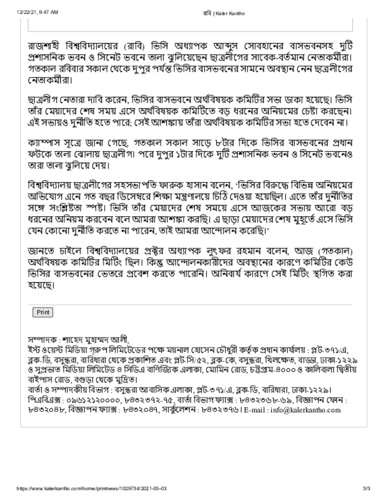 রাবি উপাচার্যের বাসভবনে তালা ছাত্রলীগের Published on 03 May 2021 Newspaper দৈনিক কালের কন্ঠ Category Campus Terrorism Download