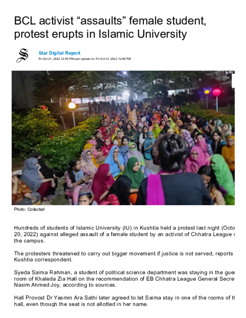 BCL activist “assaults” female student, protest erupts in Islamic University _ The Daily Star Published on 21 October 2022 Newspaper The Daily Star Category Campus Terrorism Download