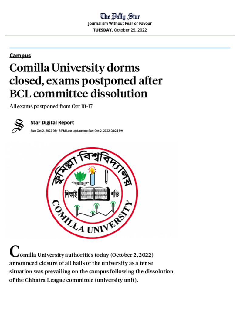 Comilla University dorms closed, exams postponed after BCL committee dissolution _ The Daily Star Published on 02 October 2022 Newspaper The Daily Star Category Campus Terrorism Download