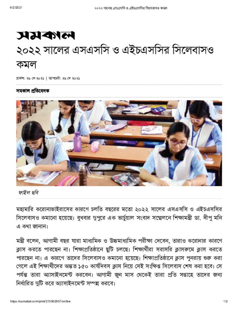 ২০২২ সালের এসএসসি ও এইচএসসির সিলেবাসও কমল Published on 26 May 2021 Newspaper দৈনিক সমকাল Category Educational Ministry / Departments Public Examination SSC Download